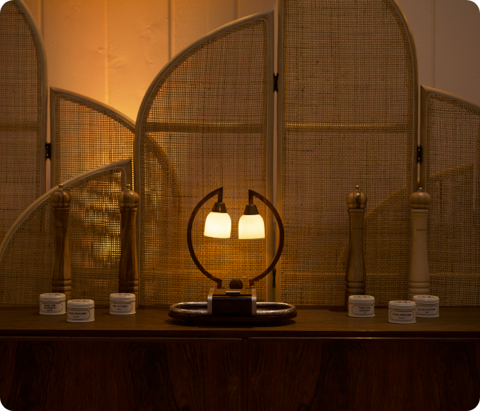Le porche de l’entrée se pare de tapis et paravents pour se métamorphoser en fumoir discret et singulier où se mêleront cigares et alcools précieux.